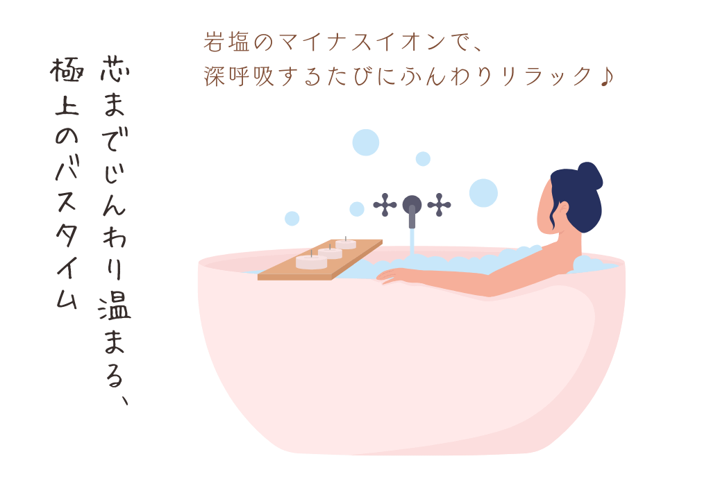 岩塩が放つマイナスイオンで心も体もリフレッシュ。続けることで冷えにくい体へ導き、お風呂上がりの肌もしっとりなめらかに整えます